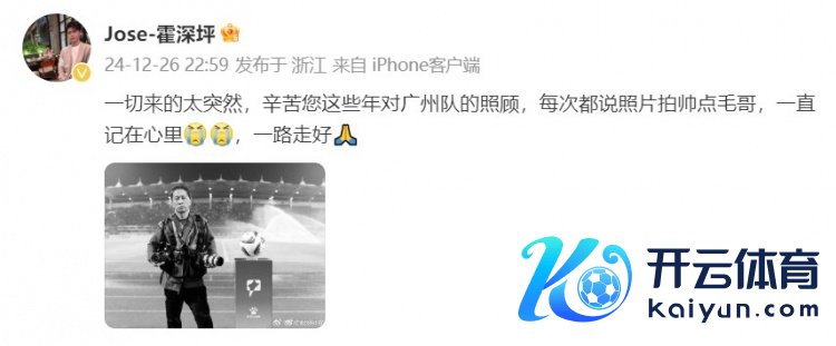 12月27日讯 昨晚,广州队通过官方微博怀念死一火的球队官方影相师阮育军先生。阮育军东说念主称“毛哥”,是广州队的官方影相师,深得球员和球迷的醉心。在得知噩讯后,广州队球员霍深坪通过更新微博抒发怀念。
