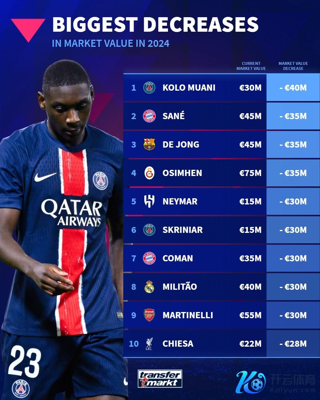 2024年已历程去,德国转会市集网站列出了2024年球员身价下落榜,巴黎时尚穆阿尼下落4000万欧最多,萨内、德容、内马尔等东说念主上榜。